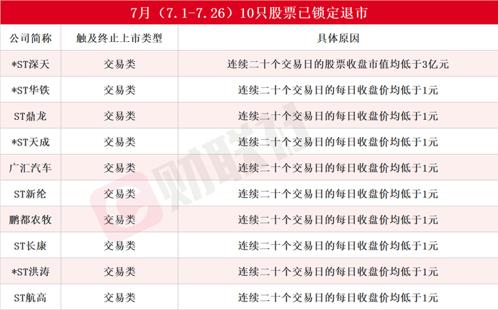 此外,据财联社不完全统计,7月包括*ST深天、*ST华铁、ST鼎龙、*ST天成、广汇汽车、ST新纶、鹏都农牧、ST长康、*ST洪涛、ST航高在内的10家A股上市公司公告收到终止上市事先告知书,提前锁定退市情形,具体情况详见下图: