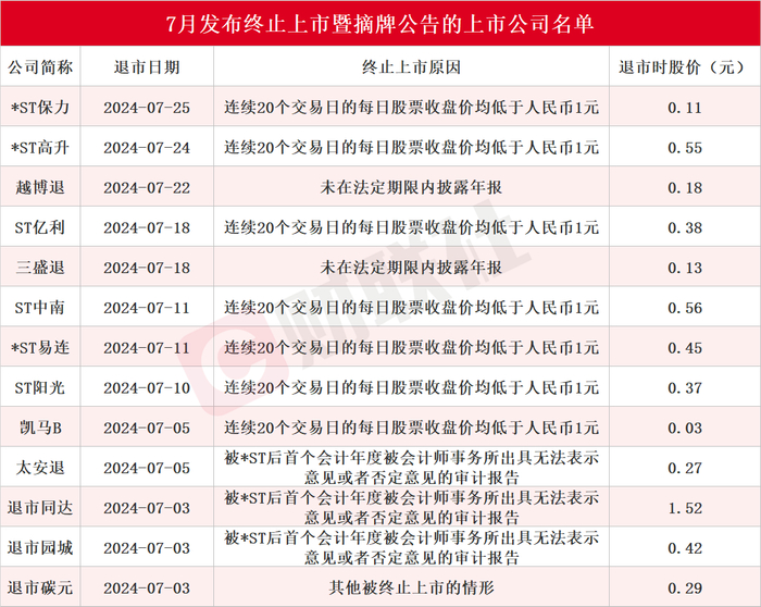Choice数据显示,7月迄今已有*ST保力、*ST高升、越博退、ST亿利、三盛退、ST中南、*ST易连、ST阳光、凯马B、太安退、退市同达、退市园城、退市碳元在内的13家上市公司退市。其中,*ST保力、*ST高升、ST亿利、ST中南、*ST易连、ST阳光、凯马B被终止上市的原因均为连续20日收盘价低于1元,具体详见下图: