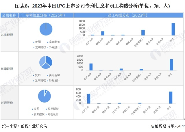 从LPG行业的上市企业已有的公开信息分析,专利信息相对较多的企业是兴通股份,其中实用新型专利27项;员工总数最多的为九丰能源,员工总数为1726人,其中技术人员总数为122人。