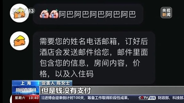 受害人陈女士:我把订单号给前台。前台说就是房间确实订了,但是钱没有支付,而且房间的价格是官网的标价,并没有便宜。