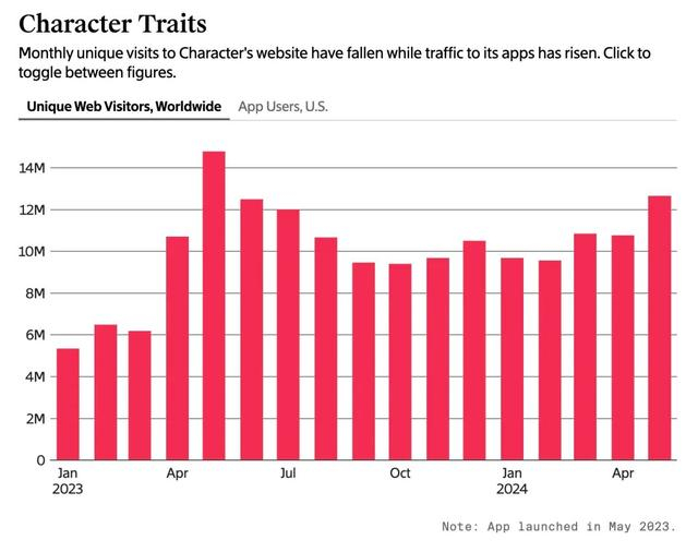 Character.ai 此前表示,自 2023 年 5 月以来,其日活用户数量增长约 2 倍,且一直在加速,公司内部还在准备下一代 LLM 来支持其聊天机器人,包括来自 Mistral 的开源模型。