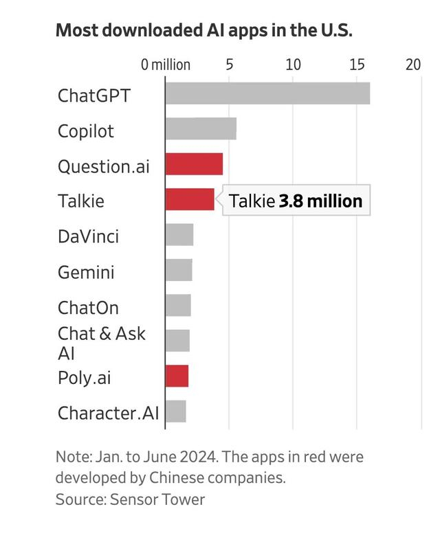 MiniMax 去年推出的娱乐对话应用 Talkie 六月份在美国AI 类应用下载量排名第五位。今年以来美国市场累计下载 380 万次,排名第四位,仅次于 ChatGPT、Copilot 以及作业帮开发的在线 AI 辅导应用 Question.ai。