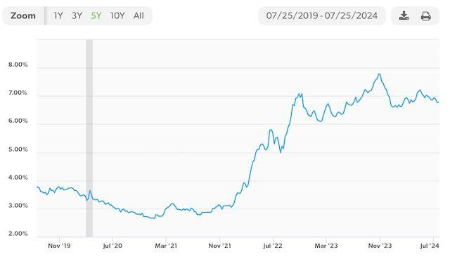 这种并不常见的供应差距被认为是由近几年来抵押贷款利率的大起大落造成的。房地美(Freddie Mac)数据显示,2021年,美国30年期固定利率抵押贷款平均利率降至2.65%的低点,在2023年11月达到7.76%的历史高点,目前的利率为6.78%。