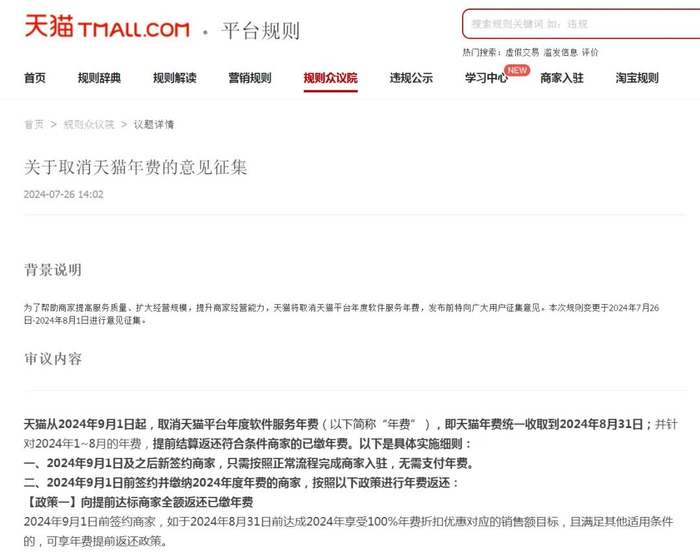 26日,天猫发布《关于取消天猫年费的意见征集》,9月1日起,天猫将取消平台年度软件服务年费(以下简称“年费”)。