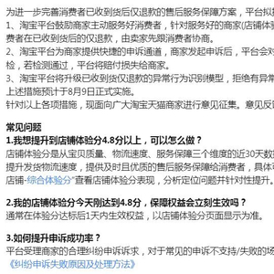 据淘宝客服介绍,“仅退款”功能优化落地后,对于店铺综合体验分大于或等于4.8分的商家,平台不会通过旺旺主动介入、支持收货后的仅退款,而是鼓励商家先跟消费者协商。