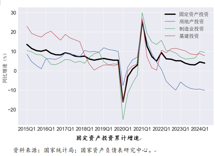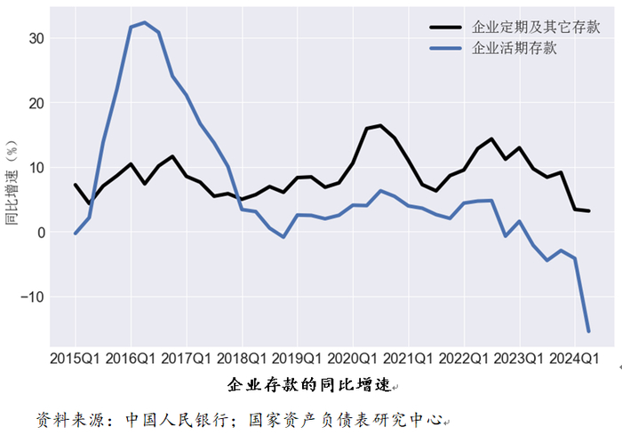 2024年二季度,非金融企业杠杆率从一季度末的174.1%升至174.3%,上升了0.2个百分点,上半年共上升了5.9个百分点。非金融企业杠杆率在今年一季度出现了较大幅的上涨后,二季度基本保持稳定。政策利率在二季度保持较低水平下的稳定,流动性相对宽松,资金供给充裕,但企业债务需求有限,债务增速已持续多年处于10%以下。限制商业银行手工补息等金融“挤水分”的相关政策也起到一定效果,降低了企业贷款增速。企业活期存款大幅下降,对应着投资需求不足。尽管经济增长新动能仍保持较快增长,但房地产投资大幅下滑留下的缺口太大,影响了房地产相关产业链上的投融资需求。
