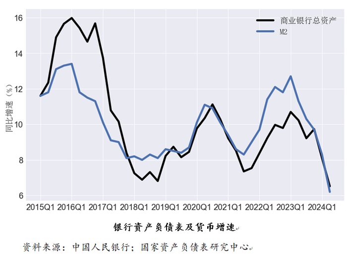 2023年二季度以来,商业银行资产负债表及M2的扩张速度开始下降。2023年以来三次降准,准备金率共下降了100个基点,释放了约2万亿元的流动性,从而降低了商业银行资产负债表的扩张速度。银行贷款、企业债券、表外资产的增速都相对较低,也导致商业银行总资产和M2的增速下降。