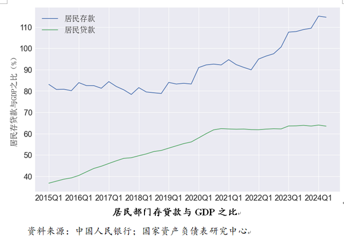 2024年二季度末居民部门的存款规模达到147.2万亿元,相比2023年年末继续增长了9.3万亿元,一季度增长了8.6万亿元,二季度仅增长了7352亿元。一方面,新增债务下降,对应的各部门新增银行存款总和也必然下降。二季度末金融机构各项存款规模相比一季度末仅上升了2666亿元。另一方面,由于居民部门的储蓄率下降,居民新增存款的资金来源也有所下降。这导致二季度末的居民存款与GDP之比相对一季度末有所下降,从115.1%下降到114.6%。预计下半年居民存款增速仍将有较大幅度的上升,全年居民新增存款规模仍在15万亿元以上。