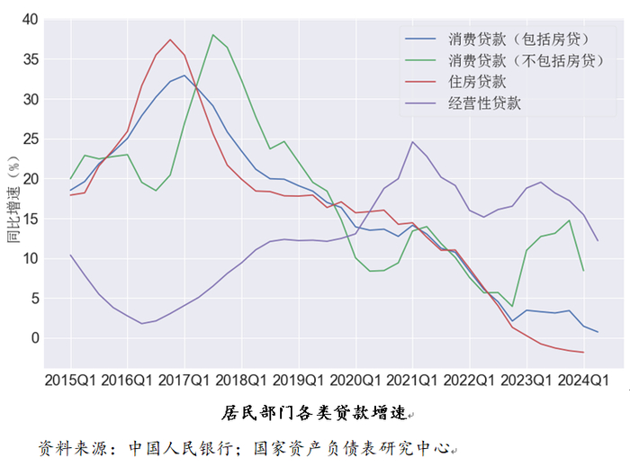 2024年二季度,居民总贷款增速降至3.8%,其中消费性贷款(包括房贷和普通消费贷)增速降至0.7%。一季度的房贷增速为-1.8%,其他消费性贷款增速为8.4%。消费贷增速仍在下降,房贷增速自2023年一季度起已经持续6个季度负增长。个人经营性贷款增速也逐步回落,二季度同比增长了12.2%。