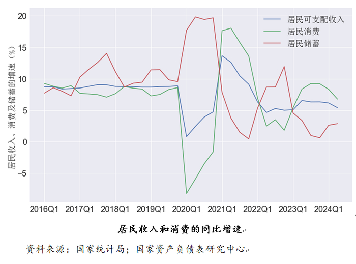 2024年上半年的全国居民人均可支配收入为20733元,相比2023年同期增长了5.4%,人均收入增速仍然是高于名义GDP增速。居民收入中的工资收入增长了5.8%,经营性收入增长了6.4%,财产性收入增长2.1%。居民收入增长领先于GDP增长,居民可支配收入占总收入的比重提高。上半年居民人均消费达到13601元,相比2023年同期增长了6.8%。居民消费增速高于居民可支配收入增速,居民可支配收入增速又高于总收入增速。居民储蓄率在下降,上半年的居民储蓄率降至34.4%,低于一季度的储蓄率,也低于去年同期的储蓄率,说明居民消费在一定程度上拉动了经济增长。