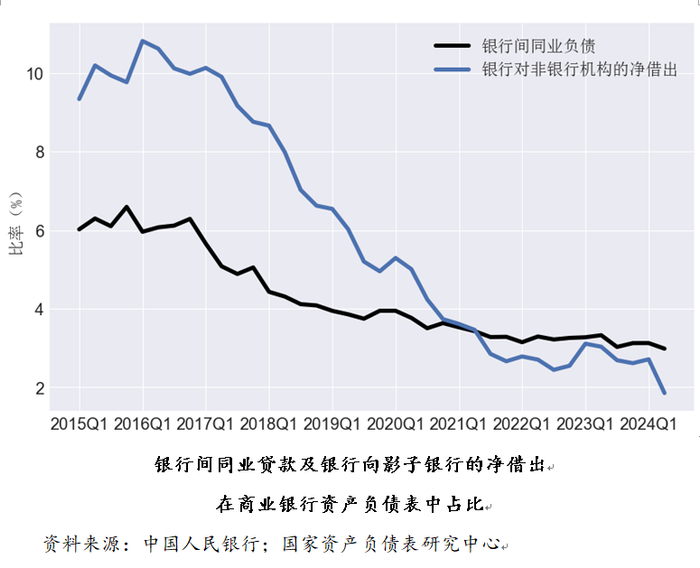 银行间同业债务在总资产中的占比相比一季度有所下降,商业银行向影子银行提供的资金规模在总资产中的占比相比一季度进一步大幅下降。2016年之后金融去杠杆的过程中,这两个比例出现一个大幅度的下滑过程。受实体经济需求下降的影响,二季度的这两个占比仍在下降。