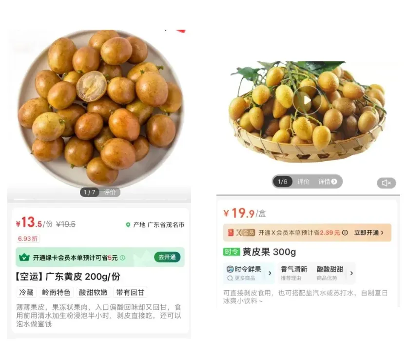 在杭州的线上平台,盒马的黄皮鲜果价格为19.9元/300g,叮咚买菜价格为13.5元/200g。