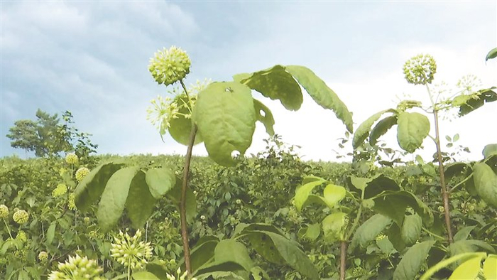 在汤原县山林中草药种植基地,基地负责人正在向游客介绍刺五加的花期及药用价值。“我们这个基地有刺五加、五味子、苍术和赤芍,每当花开的时候,游客特别多。”基地负责人贾洪波说。