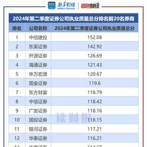 公开信息显示,2024年第二季度,中信建投以152.08的总分排在榜首,东吴证券、开源证券位列第二、三名,总分分别为142.92分、126.69分。海通证券、申万宏源、国金证券、东方财富、中信证券、广发证券、国投证券分别位列第四至第十名,总分均超过118分。