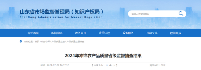山东省市场监管局2024年第1批产品质量省级监督抽查共抽查流通领域冲锋衣产品15批次。