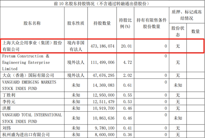 大众交通2024年一季报显示,公司持股比例在5%以上的股东仅有1家,为上海大众公用事业(集团)股份有限公司,持股比例为20.01%。