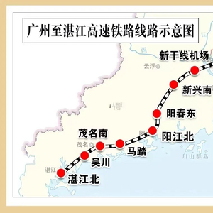 广湛高铁自广州站引出,向西经广东省佛山市、肇庆市、云浮市、阳江市、茂名市、湛江市,终至湛江北站,全长401公里,设计时速350公里。