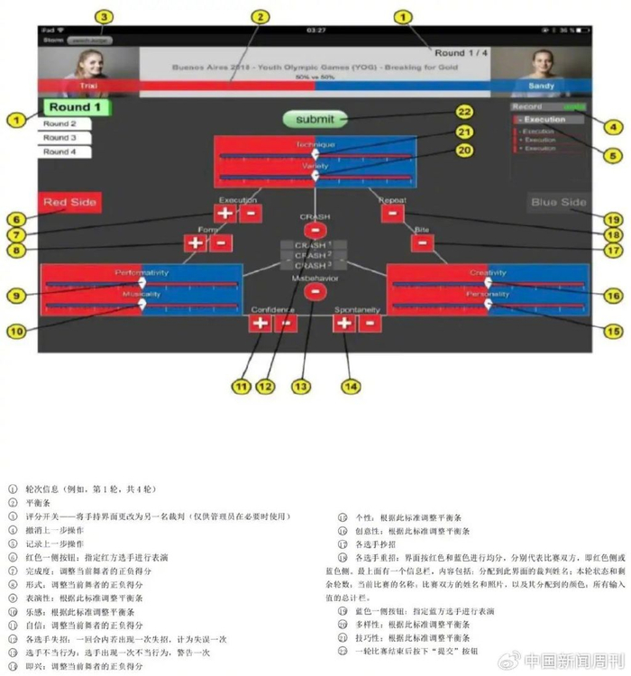 但这也不能乱发挥。霹雳舞是一个打分项目,采取Trivium原则(拨盘式打分),也就是评委在比赛中根据实际情况不断改变拨盘的具体数值。根据奥林匹克委员会官网消息,评委主要考察运动员的技术、动作丰富程度、完成度、音乐性和原创性五大指标,每项指标分别占20%的比重。