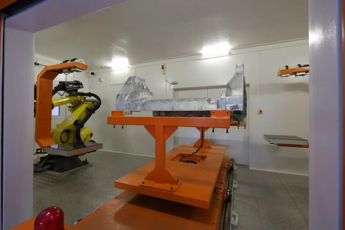 第三站就是车身车间,压铸件、冲压件、车身骨架等在这里连接组装,形成完整车身。这里给人的印象就是自动化程度极高、人工参与极少,只有部分工程师和监控操作设备的人员,剩下的就是多达700多台各式各样的机器人。