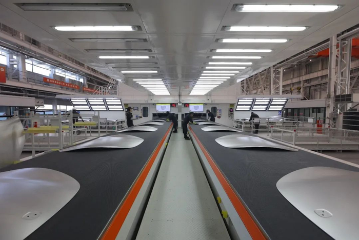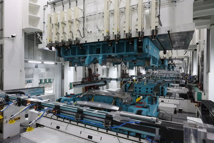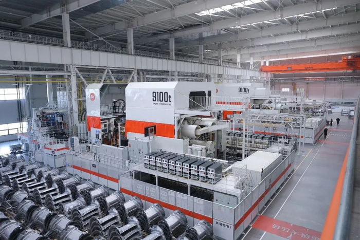 小米冲压车间能制造SU7上的所有大型覆盖件。这套冲压机床由济南二机床厂制造,瑞士古德尔提供自动化组件,能实现五序、 钢铝材料混线生产,技术水平十分先进。