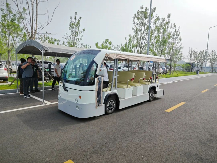 走出停车场步行3分钟,便到达摆渡车站。厂区采用纯电摆渡小车,访客和员工可以便利抵达任何角落,非常人性化的设置。
