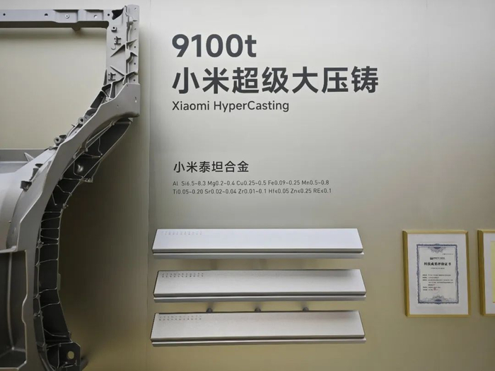 作为亮点之一,压铸机具备9100吨的锁模能力,泰坦合金在700℃高温炉熔化为液态铝;液态铝通过340倍标准大气压的压力,以25倍的重力加速度,100毫秒内注入模具;由压铸机对模具内的泰坦合金施加9100吨的压力,使金属分子更紧密,大幅提升铸件的强度和刚度。这种工艺,可以简单理解为高压铸造加锻造的生产工艺。