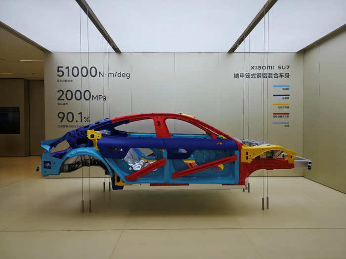 车身车间,机器人将在SU7车身共计连接2340个点,并涂上92米长的结构胶,实现100%全自动连接,形成小米SU7的钢铝混合车身骨架。