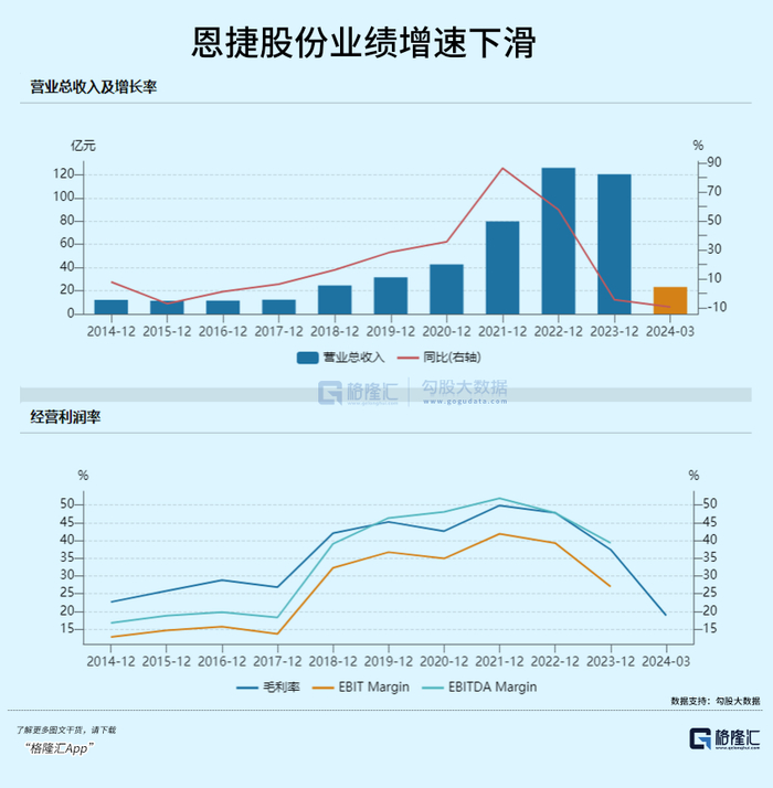 2023年度,恩捷股份的营收及及利润增速均首次转负,营收120.42亿元,同比减少4.36%,扣非归母净利润24.61亿元,同比减少35.9%。