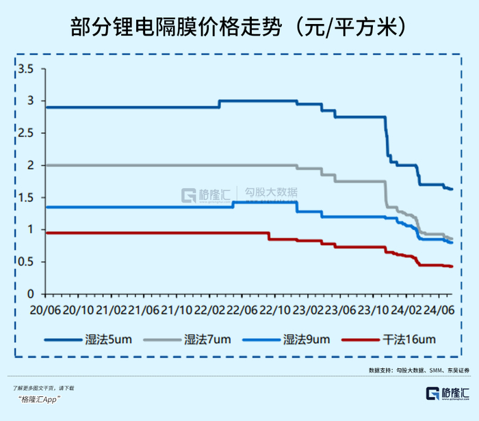 实际上,近两年来,随着锂电价格持续跳水式下跌,锂电隔膜的多个品类价格相比2023年初也出现了腰斩,直到目前尚未看到止跌趋势。