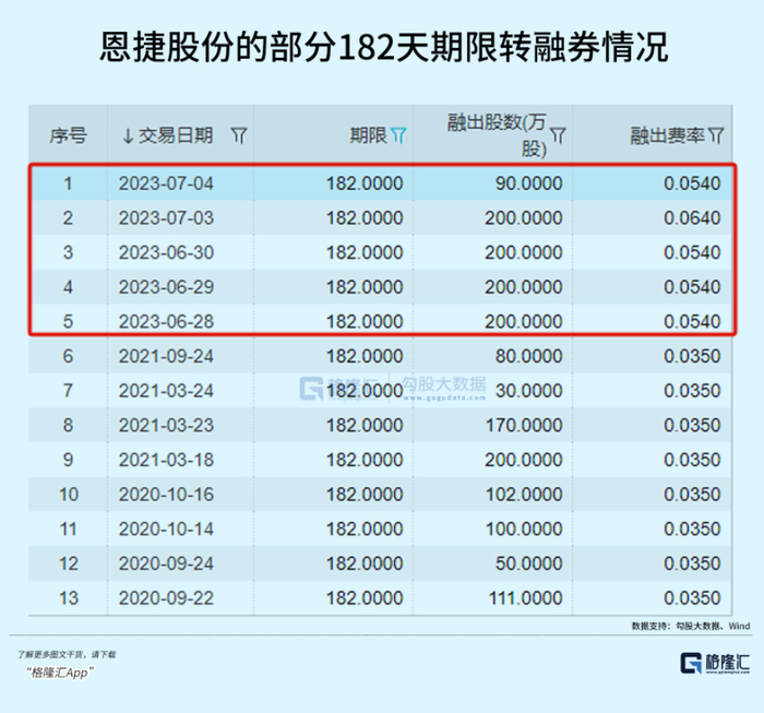尤其是在6月份方案通过后的月底,恩捷股份就接连出现了4笔200万股和1笔90万股的转融券操作(合计890万股),并且期限均为182天。这个周期直到2023年12月底,恰好就是刚过锁定期。