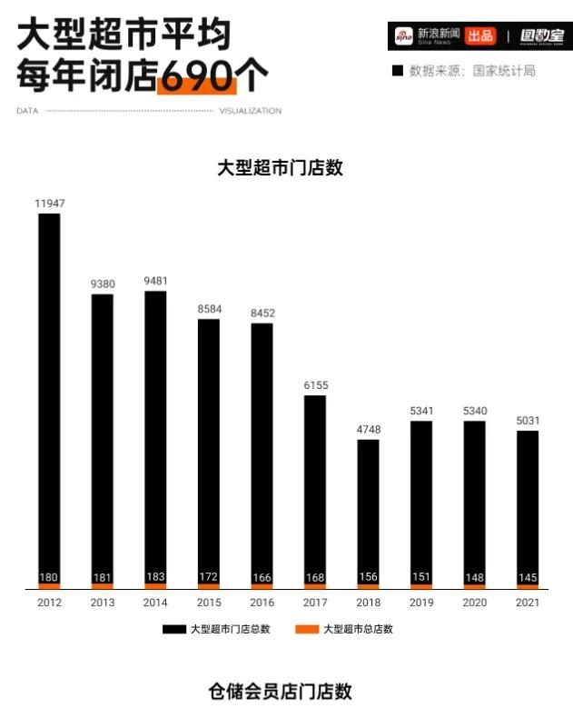从近十年的数据看,我国大型超市正在以平均每年关闭690家门店的数量缩减。2012年,我国大型超市门店总数为11947个,到2021年门店总数缩减到5340个,下降率达57.8%。