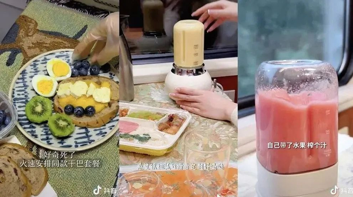有人直接从包里变出了一整间厨房,在高铁上现做干巴lunch。配文一定少不了这句——这就是商务座的仪式感,集美们又出片啦。