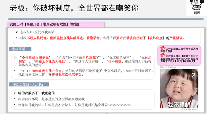 7月29日,一篇名为“金融圈手撕老板第一人”的小作文在朋友圈广泛流传,财通资管一员工在微信朋友圈、微信聊天群等公众平台发布针对该公司与相关员工的信息,内容包括高管持有过亿房产、质疑相关领导工作能力、过多的会议、自身被不公平对待等。