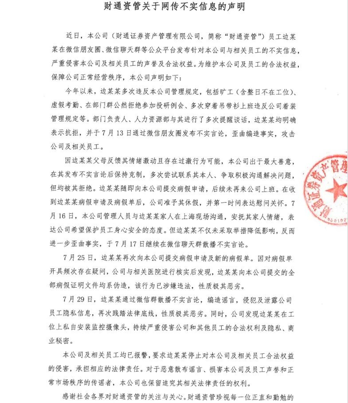 7月29日下午,财通资管发布声明称,7月29日,边某某通过微信群散播不实言论,编造谣言,侵犯及泄露公司员工隐私信息,再次践踏法律底线,性质极其恶劣。
