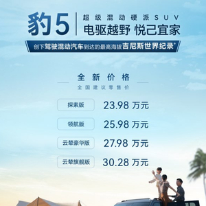 据悉,“豹5”于2023年11月9日正式上市,与彼时官方指导价(28.98万元—35.28万元)相比,该车全系车型售价下调了5万元。