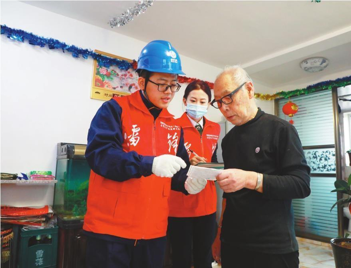 图为国网阜新供电公司电力网格员到独居老人家中帮助检查用电设施,讲解用电知识和缴费方法。