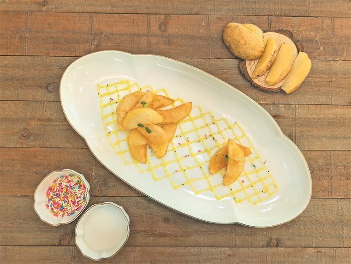 范光伟掐准时机将土豆片捞出,均匀装盘,撒上适量白糖和朱古力,一道气泡土豆片就做好了。轻轻一咬,香甜的土豆与微妙的朱古力糖衣交织在一起,让味蕾得到双重享受。