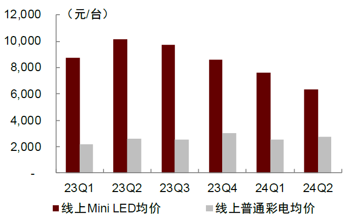 彩电高能效产品占比低,我们估计是消费者关注彩电性价比导致。我们预计下半年彩电一二级能效产品占比有望大幅提升,有利于Mini LED产品占比提升。近年来,得益于下游品牌厂商推动、市场需求提升、以及上游供应链成本优化,Mini LED彩电在国内渗透率快速提升。根据AVC数据,2022年至2Q24,国内线上/线下Mini LED彩电零售量占比分别从1.0%/1.7%提升至14.0%/13.1%。头部厂商TCL电子、海信视像等坚持高端化和大屏化战略,在Mini LED细分赛道中的市占率更高。1H24 TCL系/海信系/小米在mini LED线上零售额份额分别为35%/27%/22%。我们认为Mini LED占比的提升也有助于龙头的份额集中度持续提高。