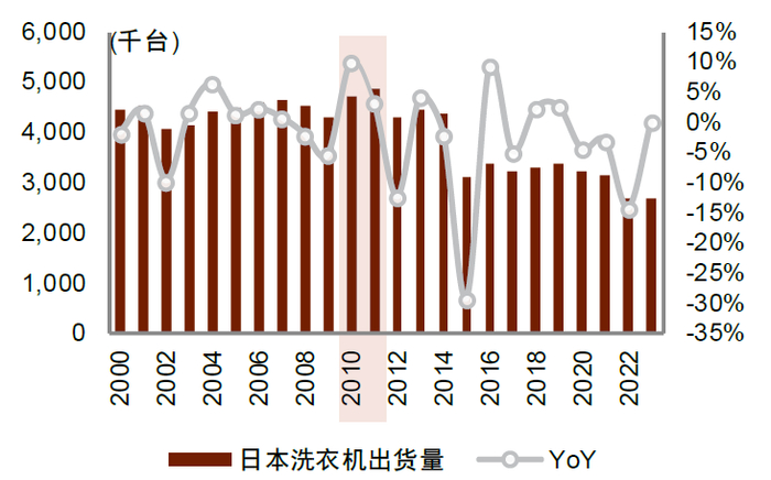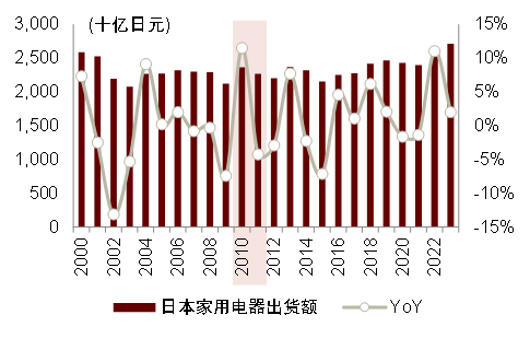 日本家电更新需求占比高,政策补贴对当下国内市场具有借鉴意义。日本家电市场发展成熟,冰箱、洗衣机、彩电的家庭渗透率早在1970年代就已经接近天花板,空调品类自1990年代开始也已经突破100台/百户,除空调外,其余大家电品类基本均以更新需求为主导,与国内家电市场目前的情况较为类似。2009年日本政府推出积点政策后,对销量拉动明显,2010年冰箱、空调、洗衣机出货量增速都达到或接近20年内的最高增速水平,电视出货量更是达到至今仍未超越的历史最高水平。