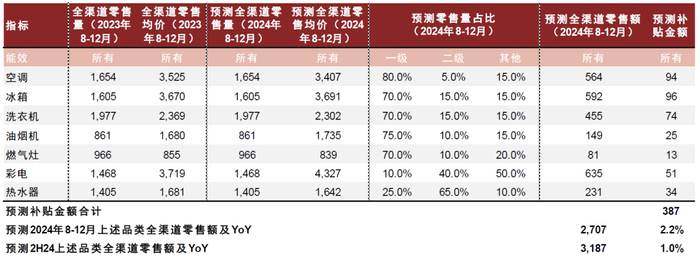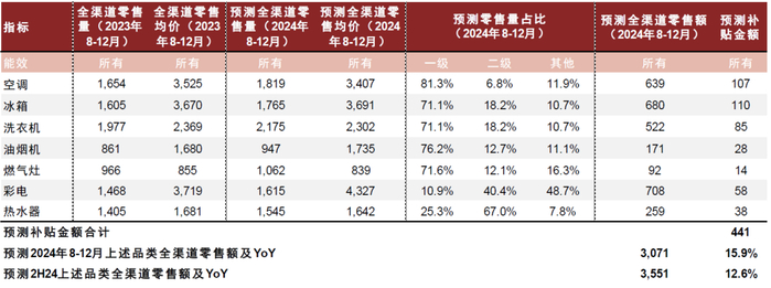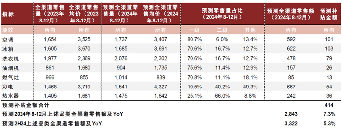 注:1)零售量单位万台,零售额单位亿元,零售均价单位元/台;2)冰箱、空调、彩电、热水器一二级能效零售量占比的基准数据参考AVC《2024年中国家电品质消费白皮书》,洗衣机、油烟机、燃气灶能效的基准数据参考GKF,我们在此基础上进行合理假设;3)2024年8-12月各品类全渠道零售均价较2023年同期的增速,我们参考各品类2024年1-6月零售均价变化情况;4)因各级能效产品零售均价数据缺失,我们简便采用各品类2024年8-12月各品类的预测零售均价做统一计算。
