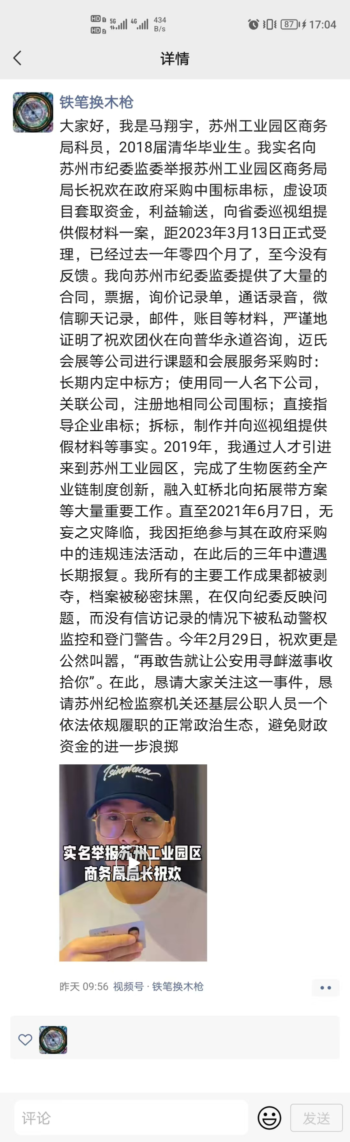 日前,微信视频号“铁笔换木枪”发布一则实名举报视频引发广泛关注。视频中,自称2018年清华毕业生、苏州工业园区商务局科员的马翔宇,实名举报苏州工业园区商务局局长祝欢涉嫌违纪违法。