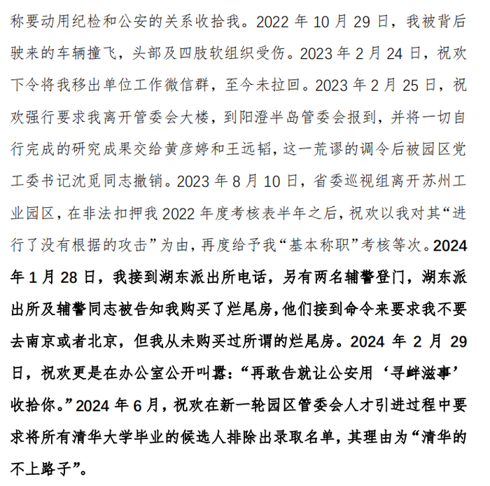 马翔宇的举报信甚至透露,2022年10月份,他还被背后驶来的车辆撞飞,一度导致头部及四肢软组织受伤。之后他被祝欢下令移出单位工作群,甚至强行要求离开苏州工业园区管理委员会大楼,欲调令他至它处。