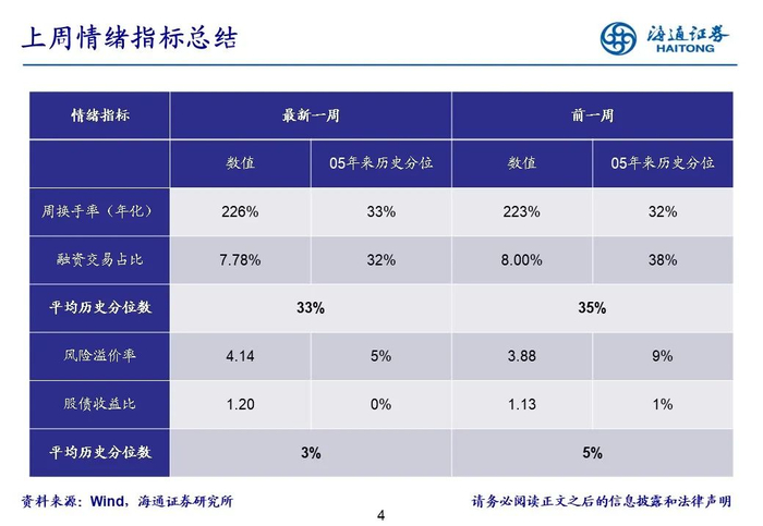 2)短期情绪指标处于05年以来中低位,长期情绪指标处于05年以来低位:短期情绪指标主要看换手率和融资交易占比,最近一周换手率(年化)为226%,较前一周的223%上升。2005年以来换手率的高点、低点、均值分别为1719%、87%、345%,当前处在历史上由低到高33%的分位;最近一周融资交易占比为7.78%,较前一周的8.0%下降。2013年以来融资交易占比高点、低点、均值分别为17.95%、4.07%、8.92%,当前处在历史上由低到高32%的分位。长期情绪指标主要看大类资产比价,一看价格对比,最近一周A股风险溢价(全部A股PE倒数减十年期国债收益率)为4.14%,较前一周的3.88%上升。2005年以来风险溢价的高点、低点、均值分别为4.78%、-2.66%、1.93%,当前处在历史上由高到低6%的分位;二看收益率对比,最近一周300指数(除金融)股息率/十年期国债收益率为1.2,较前一周的1.13上升。2005年以来数值的高点、低点、均值分别为1.27、0.1、0.57,当前处在历史上由高到低0%的分位。