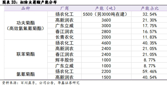 公司是国内拟除虫菊酯杀虫剂龙头和全球拟除虫菊酯原药核心供应商。公司的杀虫剂主要有拟除虫菊酯系列产品,分为卫生用药和大田用药,卫生用药主要用于室内蚊虫趋避消杀,是公司的特色品种;大田用药主要用于蔬菜、茶叶、果树等作物的害虫防治。公司菊酯产能为国内第一,卫生菊酯在国内的市场占有率约为 70%,是国内拟除虫菊酯杀虫剂龙头和全球拟除虫菊酯原药核心供应商。公司菊酯产品具有核心竞争优势,在菊酯行业中品种最丰富、技术最全面、产业链最长,菊酯类产品品种数量排名世界前列,产能丰富,包括5500吨功夫菊酯(高效氯氟氰菊酯)、4600吨联苯菊酯和2200吨氯氰菊酯,另外葫芦岛还有3000吨功夫菊酯产能在建,预计2025年末投产。