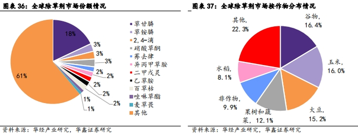 转基因作物快速推广带动除草剂需求大幅增长。除草剂行业发展历经三个阶段:第一阶段(1940年以前),当时没有选择性、高毒低效的无机除草剂使用最为广泛;第二阶段(1945-1996年),2,4-滴的引入标志着世界进入有选择性除草剂时期;第三阶段,转基因作物(尤其是抗除草剂性状作物)在全球范围内得到快速推广,带动非选择性除草剂需求大幅增长。2020年全球除草剂行业市场规模为244亿美元,占全球农药行业的比重为40.2%,预计2025年全球除草剂行业市场规模将达到265亿美元。从除草剂品类来看,全球使用最多的农药是草甘膦,其市占率达到18%,其次是草铵膦,市占率为3%,此外2,4-D、硝酸草酮、莠去律、异丙甲草胺、二甲戊灵等也是较为常见的农药品种。从除草剂应用作物分布来看,谷物、玉米、大豆、果树和蔬菜应用分布较多,市场占比分别为16.4%、16.0%、15.2%、12.1%。