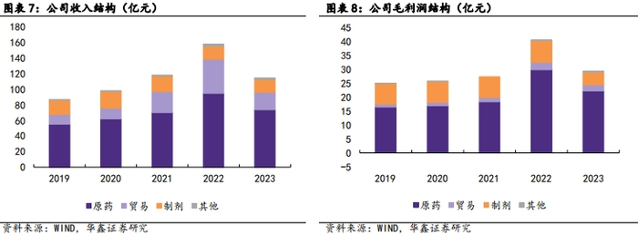 原药业务贡献核心营业收入及利润。公司业务主要分为农药原药、制剂、贸易及其他。从营业收入构成看,2023年公司农药业务(原药+制剂)收入占比为79%(其中原药业务占比64%),其他业务收入占比21%。从毛利贡献来看,2023年农药业务(原药+制剂)毛利贡献比例在91%(其中原药业务占比76%),其他业务的毛利贡献为9%。