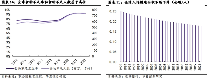 粮食终端需求具备韧性,人均耕地下降对亩产提出更高要求。根据联合国粮食及农业组织等多机构联合发布的《2023年世界粮食安全和营养状况》报告,2022年全世界有6.91至7.83亿人面临饥饿,人口食物不足率9.2%,高于2019年的7.9%,原因包括:(1)俄乌战争导致粮食供给下降;(2)农业投入品和能源价格持续飙升侵蚀贫困国家购买力;(3)厄尔尼诺等极端天气事件加剧粮食不安全。报告预计2030年仍将有近6亿人长期食物不足,难以在2030年如期实现“零饥饿”目标。展望未来,地区不稳定和极端天气因素仍无法消除,人均耕地面积下降对粮食亩产提出更高要求,粮食需求具备韧性。