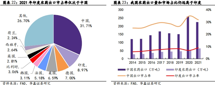 长期来看中企仍有优势。印度农化出口阶段性增长由特殊的阶段性和结构性原因导致,但由于技术原因、环保问题等其优势在长期内并不具有可持续性。实际上,中国农化产业实力仍远强于印度,印度难以撼动中国在国际农化产业中的地位:一是我国原料、中间体、产品、下游产业链布局完善,原料品类齐全;二是我国基础设施配套完善,产业发展基础较好;三是我国精细化工合成水平高,熟练技术工人充足;四是我国企业不断加强技术创新和品牌建设,国际竞争力强劲。根据中国海关总署统计数据,2022年我国农药出口额209亿美元,同比增长38.7%,远超印度农化产品2022-2023财年55亿美元出口额。2021年,我国农药出口在全球农药出口中的占比达到31.71%,仍远高于印度占比8.97%。