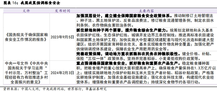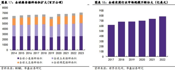 粮食安全战略高度上升,鼓励提升粮食种植面积带动农药需求。根据世界银行,2024年粮食安全可能仍是世界面临的一项关键挑战,并将粮食和营养安全列为需要大规模应对的八项全球挑战之一。全球粮食种植面积不断扩大和对单亩产量的更高要求形成对农药需求的有力支撑。我国高度重视粮食安全,中央一号文件强调要加大种植者补贴力度,稳定粮食播种面积,把粮食增产的重心放到大面积提高单产上,确保粮食产量保持在1.3万亿斤以上,有利于稳定农药产品需求。