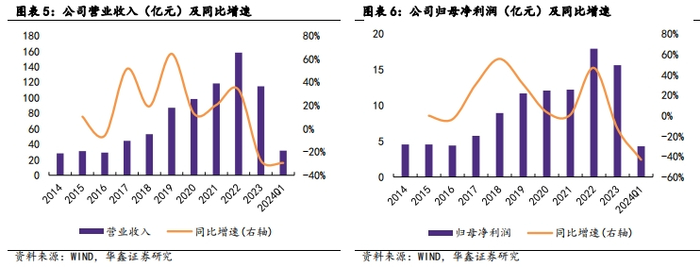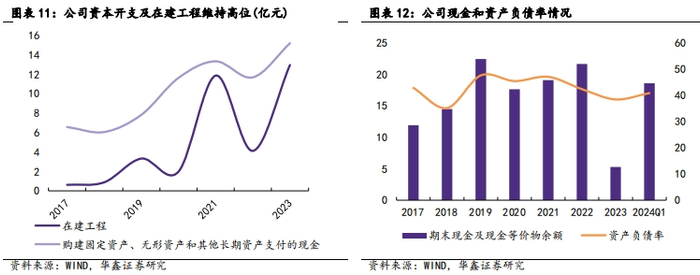 资本开支维持高位,资产负债率健康。公司构建固定资产、无形资产和其他长期资产支付的现金由2017年的6.57亿元增至2023年的15.18亿元;在建工程由2017年的0.62亿元增至2023年底的12.94亿元。公司财务风格较为稳健,资产负债率长期维持在40%左右的合理水平。截至2024年一季度末公司期末现金及现金等价物余额18.55亿元,环比去年四季度末增长13.27亿元,充沛的现金流为公司未来项目持续推进提供保障。2023年度公司现金分红比例为 22.85%,公司自上市以来,持续进行现金分红,累计分红已达累计募集资金的2倍以上。